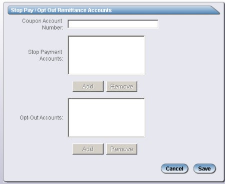 To add this account number to the Stop Payment Accounts list, select the Add button. If this account is listed in the Stop Payment Accounts list and you want to remove it, select the Account in this area and press Remove. |