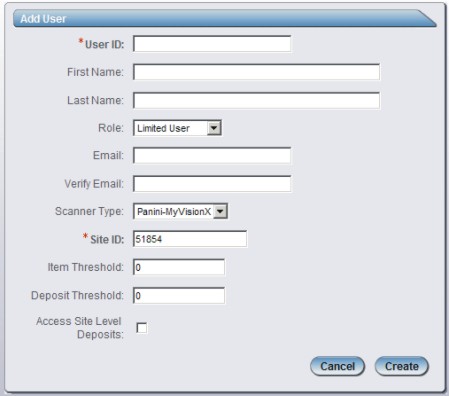 Note: This field displays only if Limited User is selected as the Role. If the user is assigned a Limited User role, enter the maximum item amount with which this user is allowed to work. This field should be a non zero positive number. A Limited user is allowed to add checks to the deposit only if the check amount is equal to or less than the threshold. |